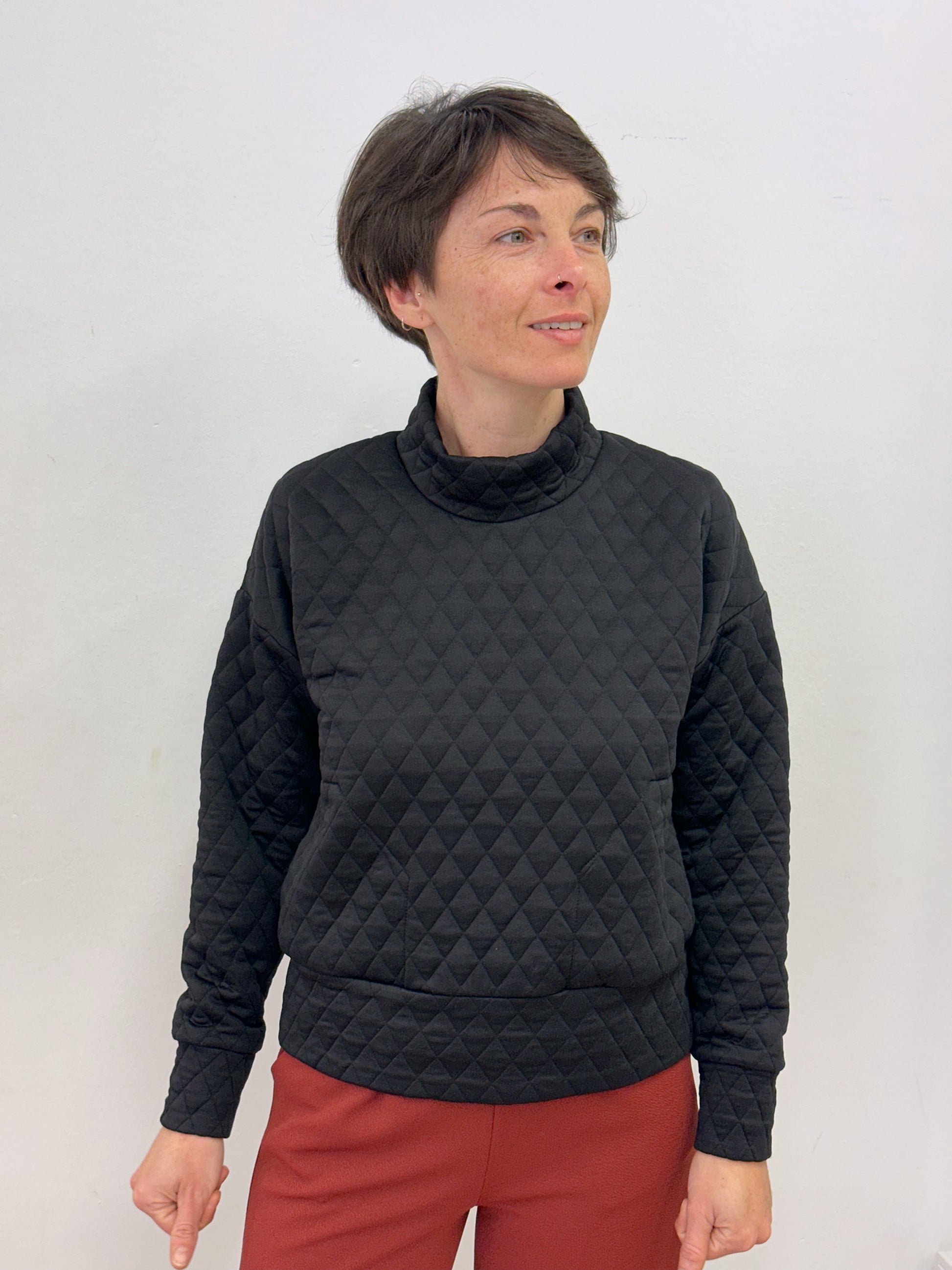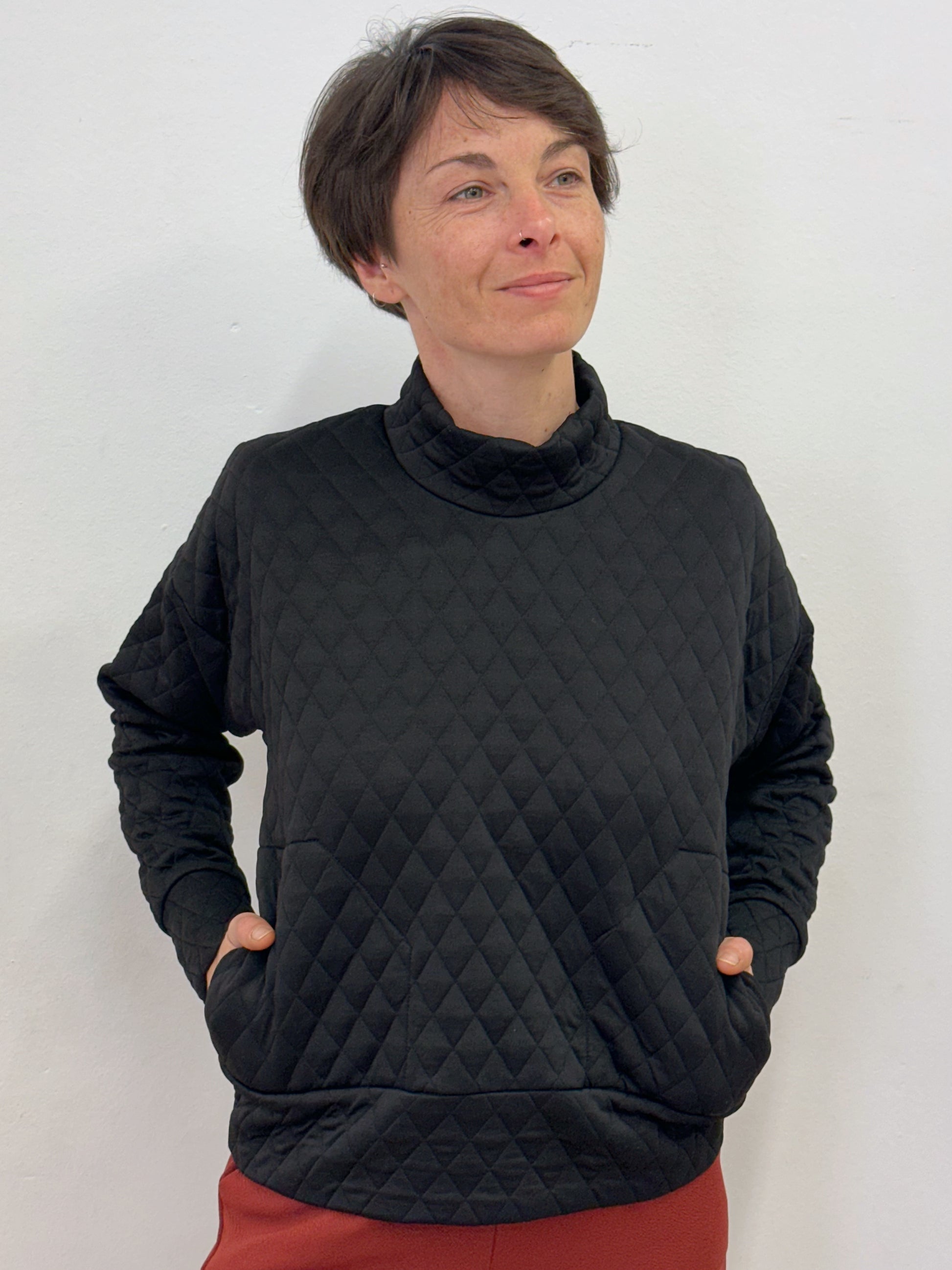 Un bàsic amb caràcter i textura. Aquest jersei acolxat, amb un subtil patró de rombos, combina comoditat i elegància en una peça suau i càlida. El coll alt i les butxaques frontals el fan ideal per als dies freds, mantenint-te abrigada sense perdre lleugeresa.