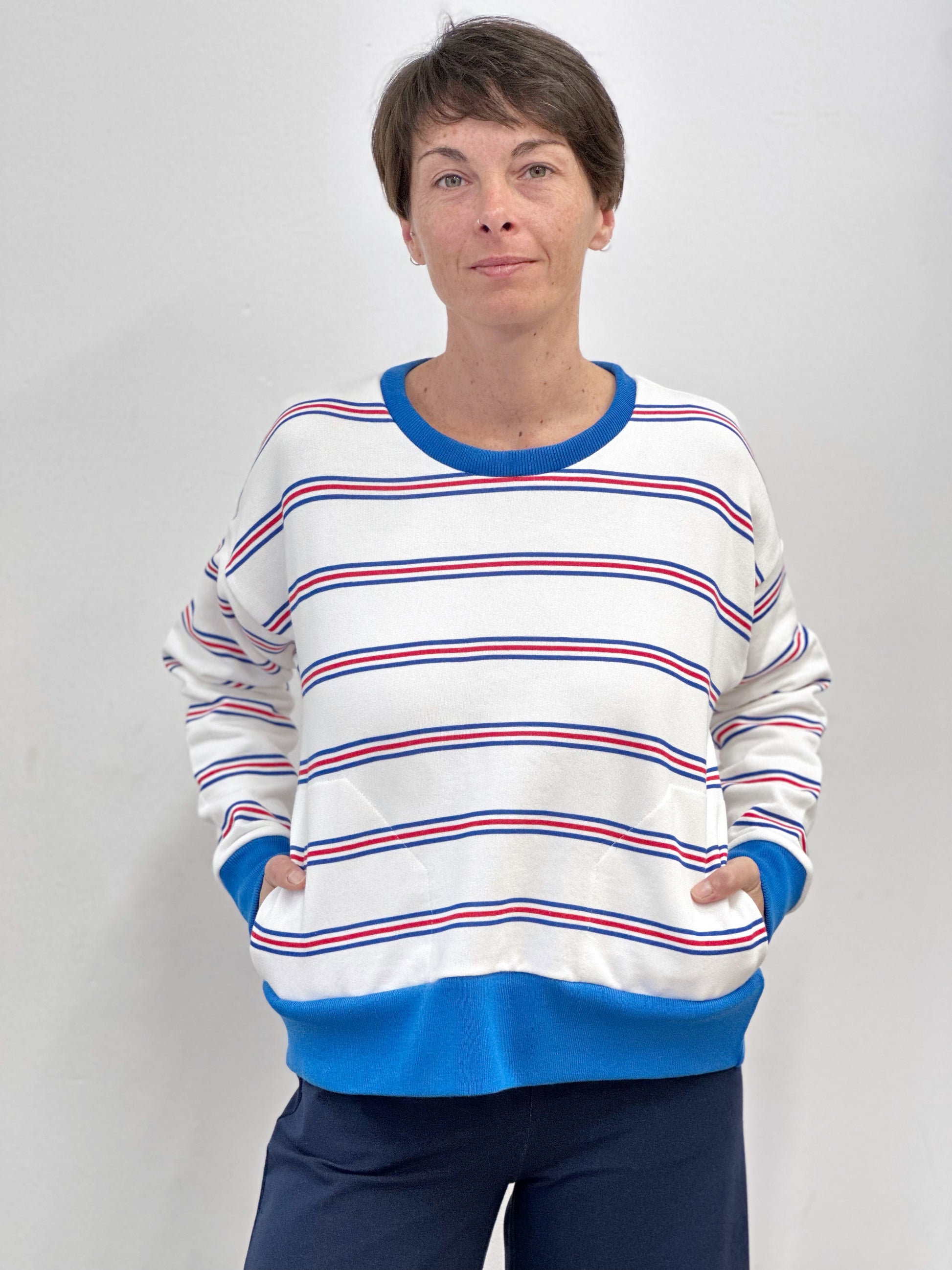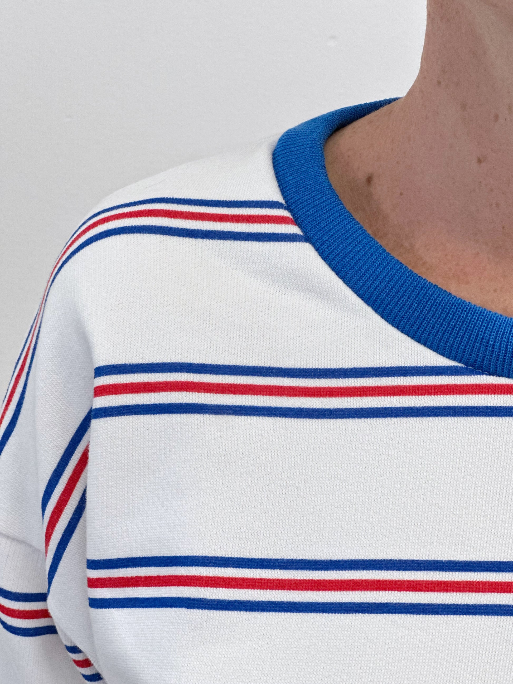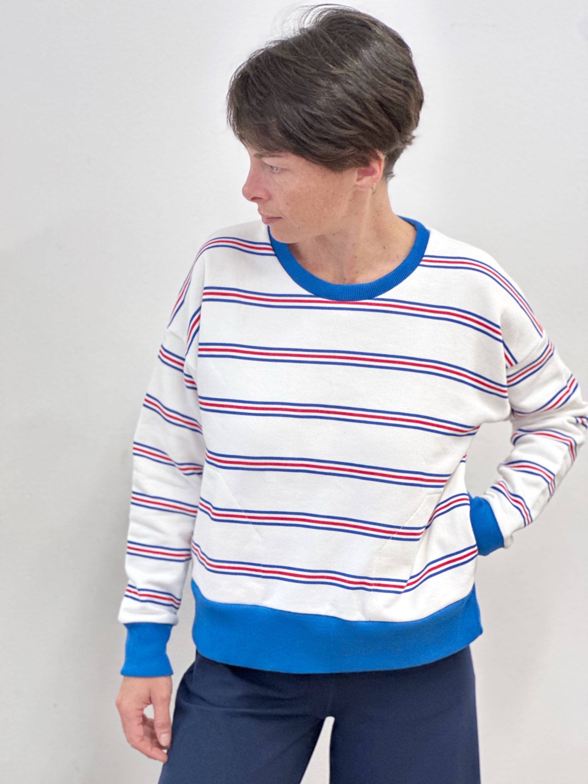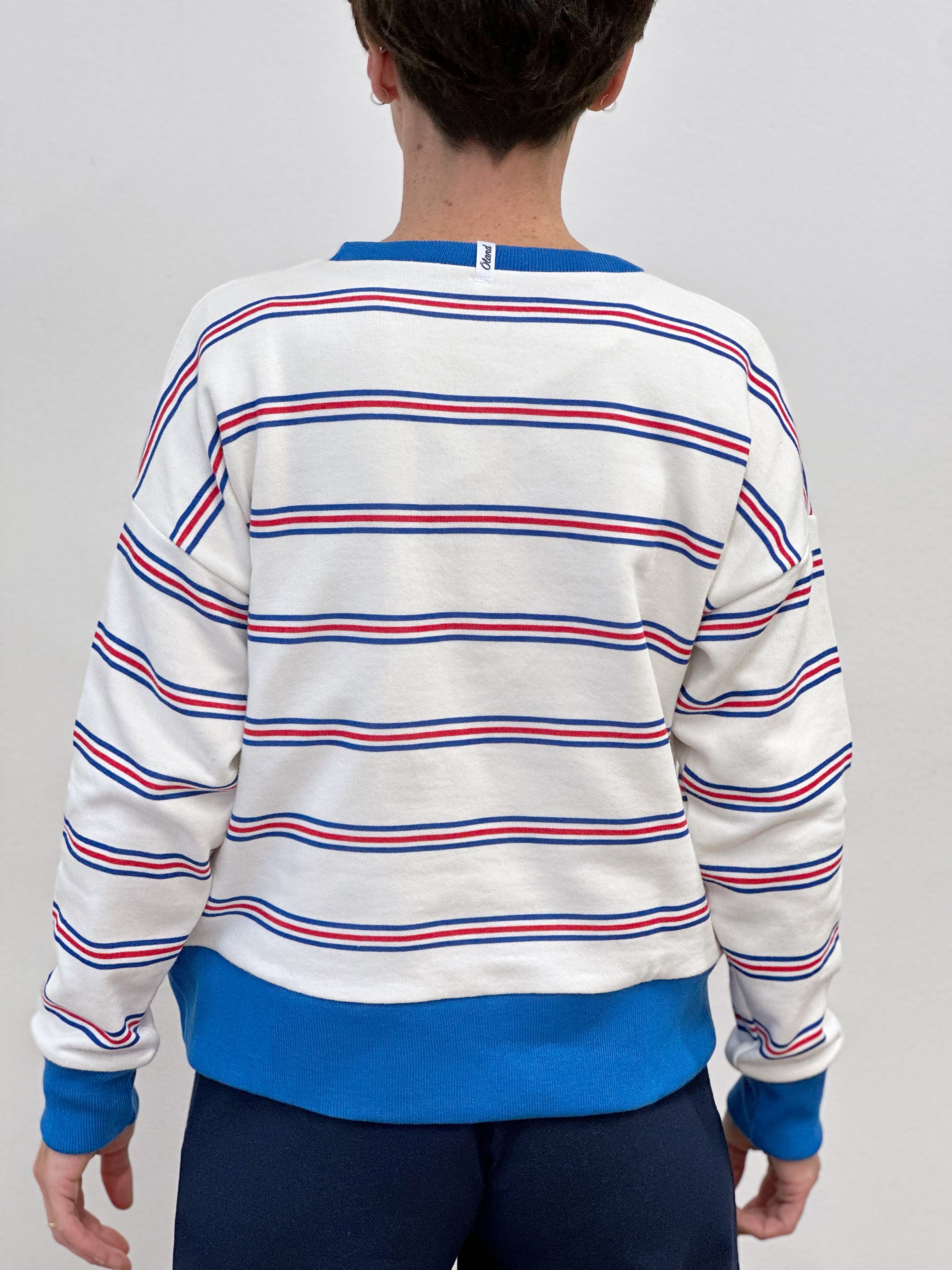 Una peça amb aire esportiu i molt retro. De color blanc amb ratlles fines blaves i vermelles, i acabats de canalé blau. Perfecta per combinar amb els pantalons blaus d’aquesta col·lecció o amb uns texans bàsics.