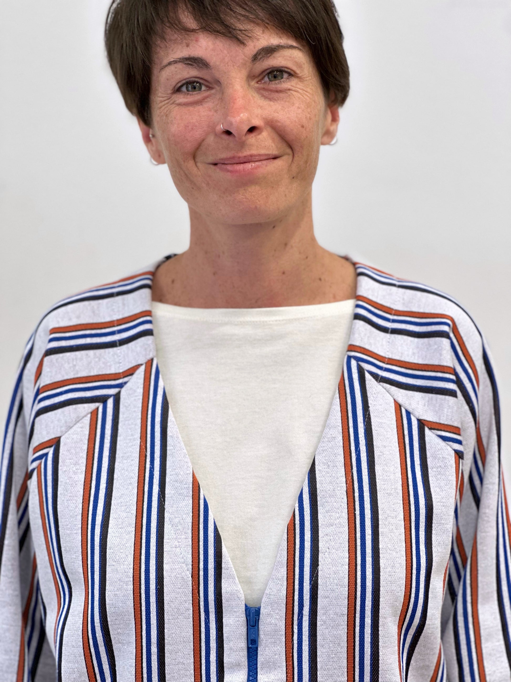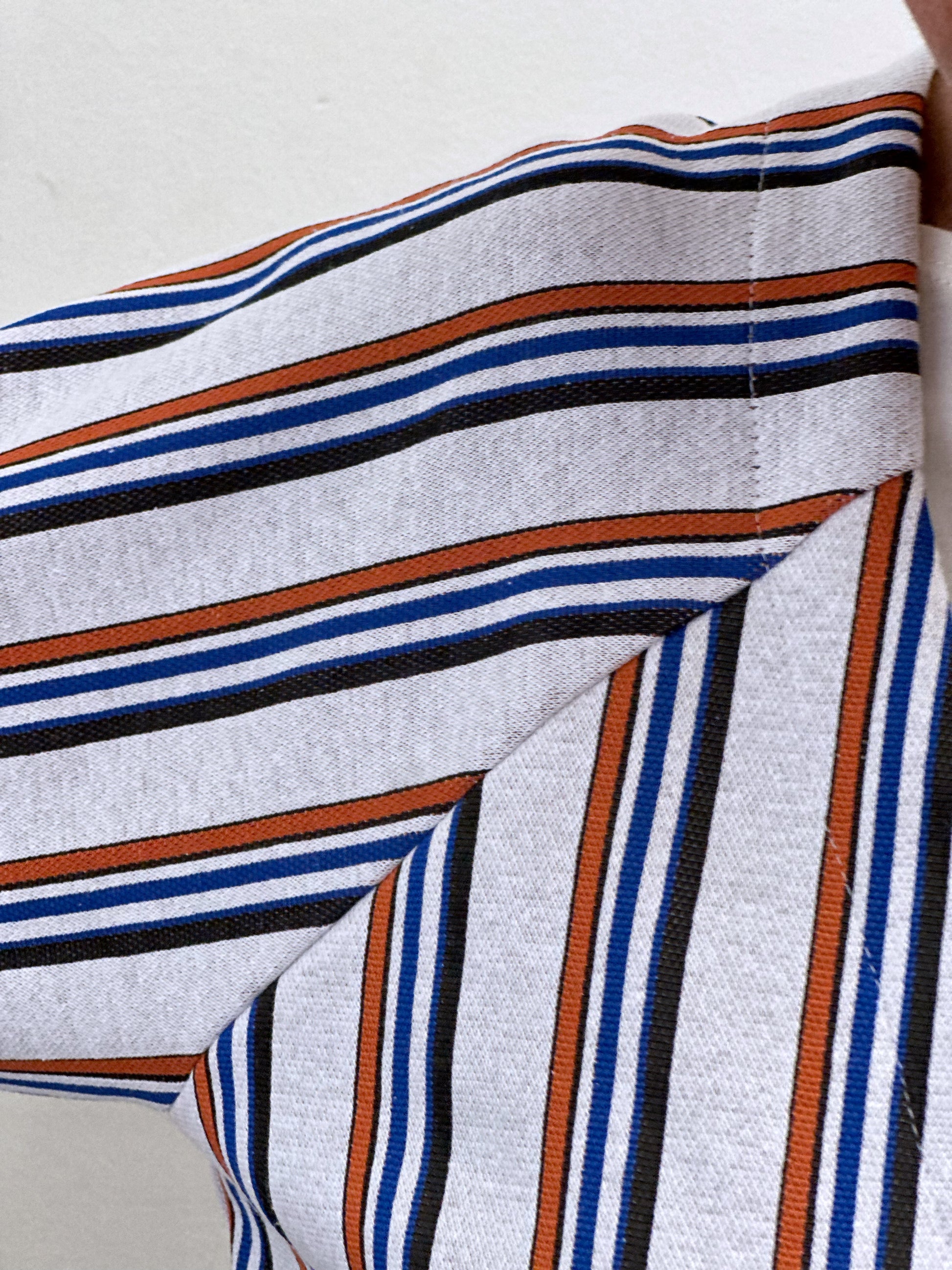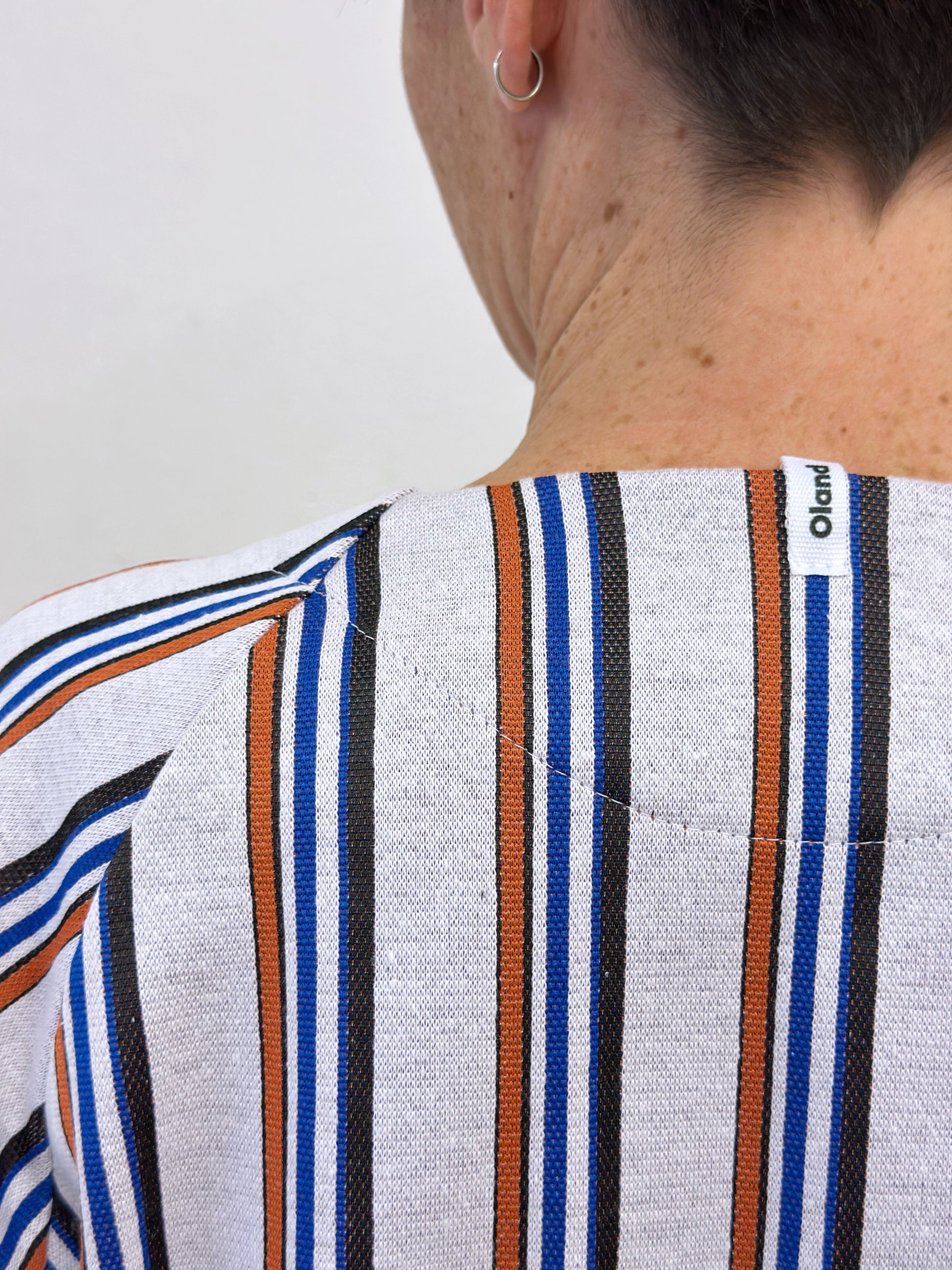 Aquest model és blanc amb ratlles verticals en taronja, blau i negre. La cremallera blava i les butxaques amb ratlles horitzontals aporten un toc retro fresc i diferent i una mica retro.