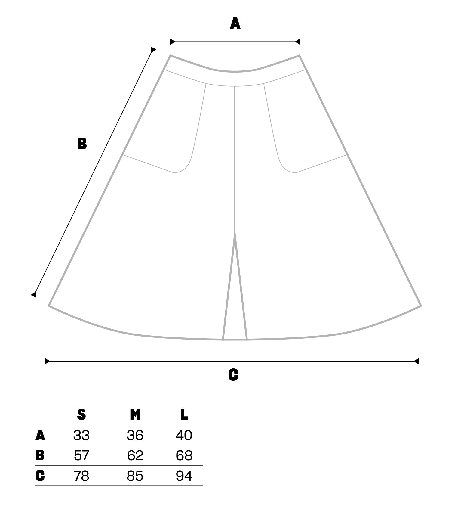 És una faldilla tipus evasé fins a sota el genoll amb butxaques i un tall central. El teixit és punt roma de color lila.