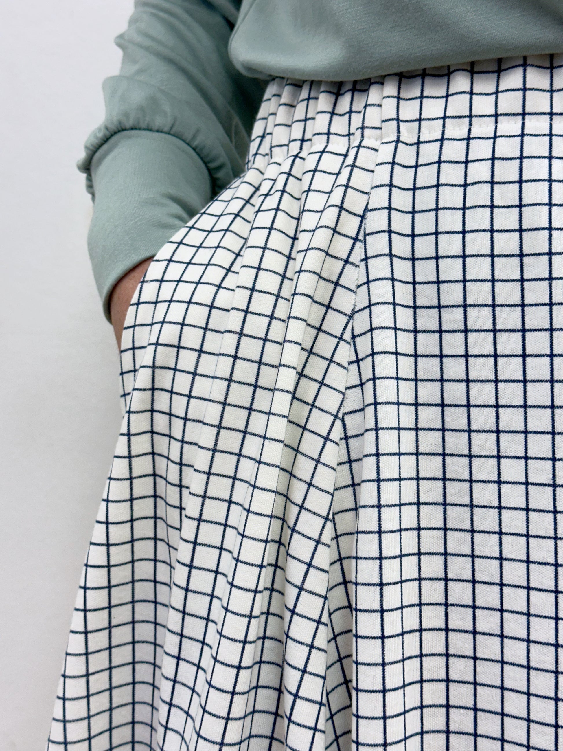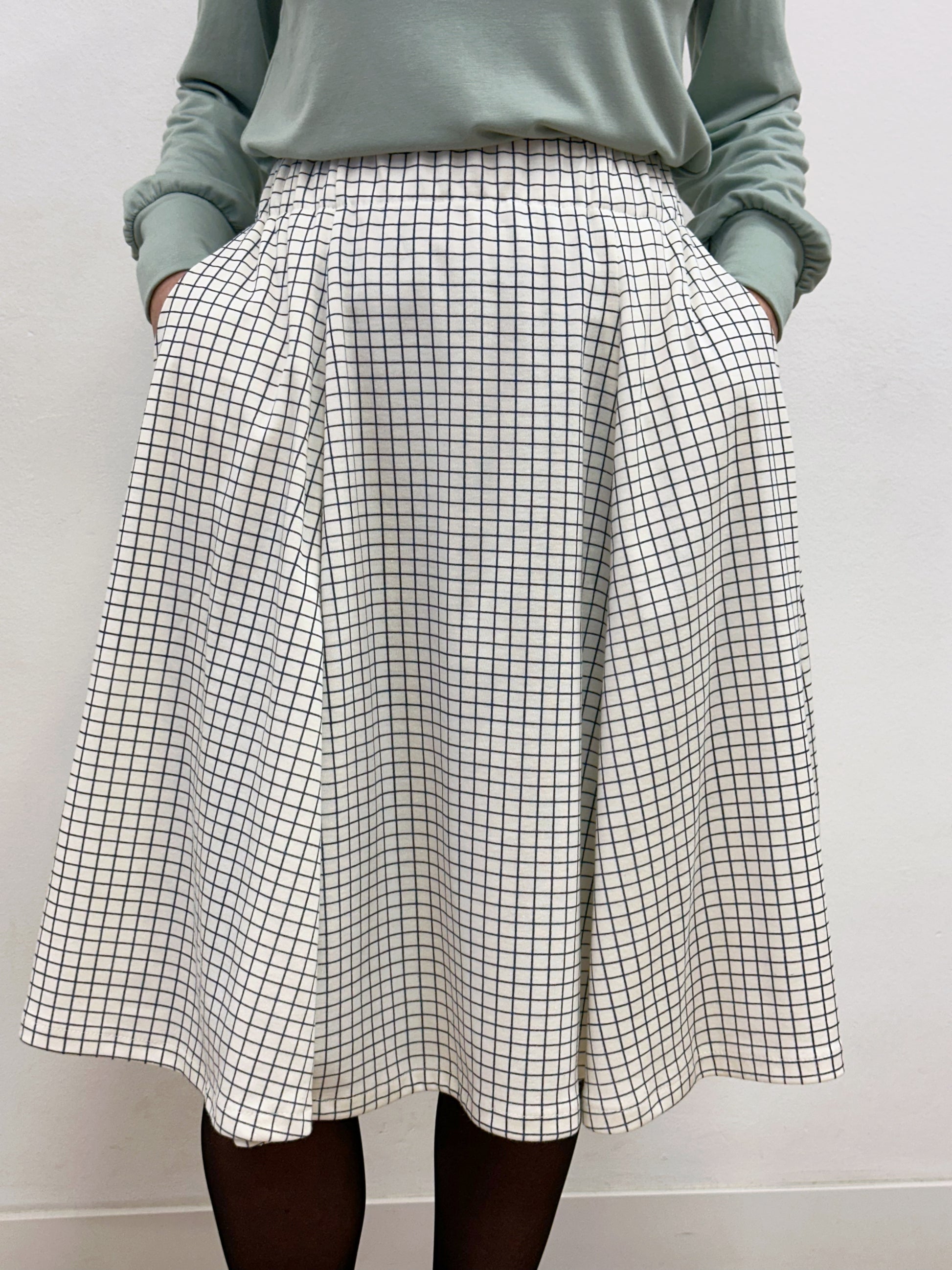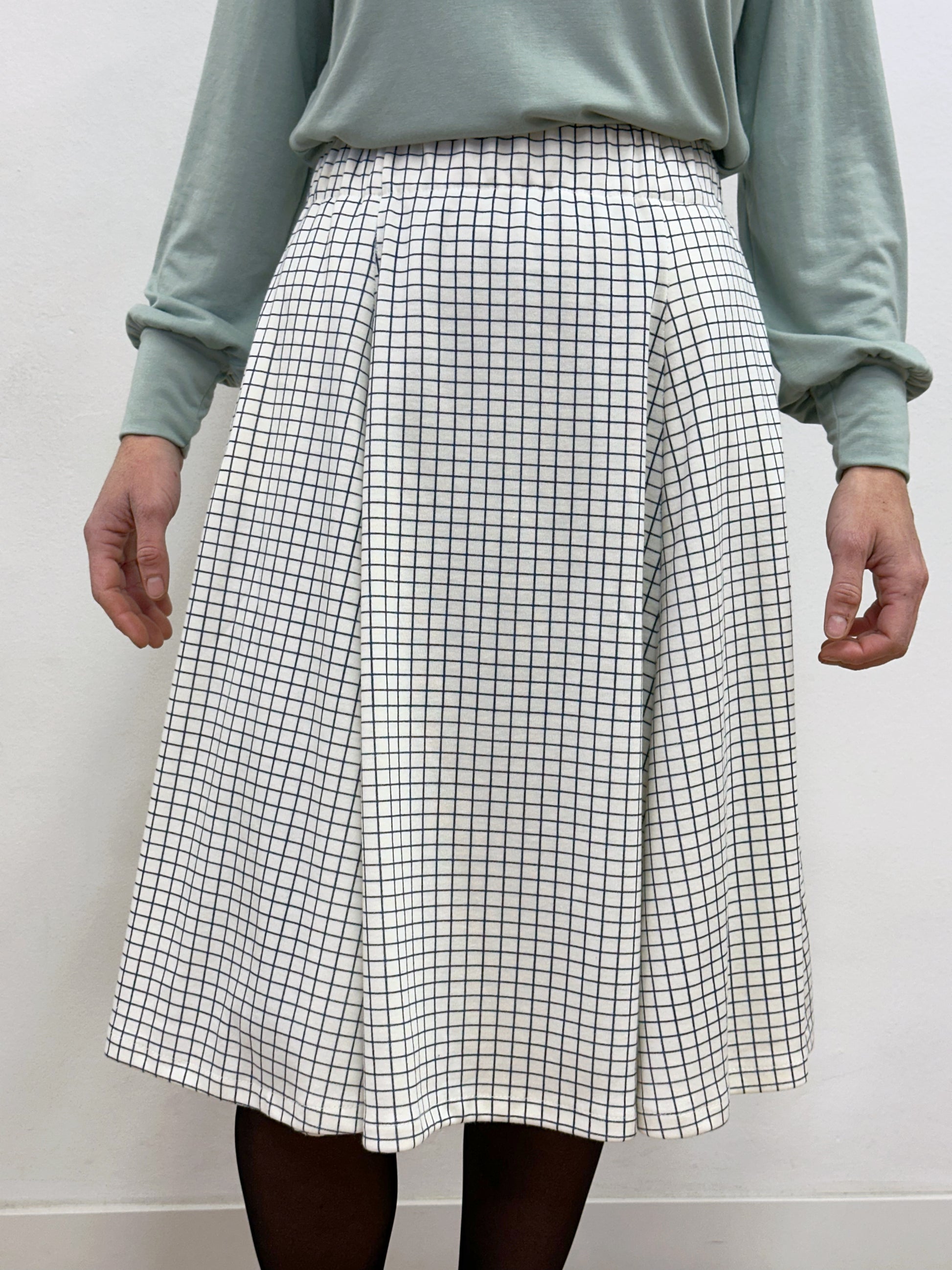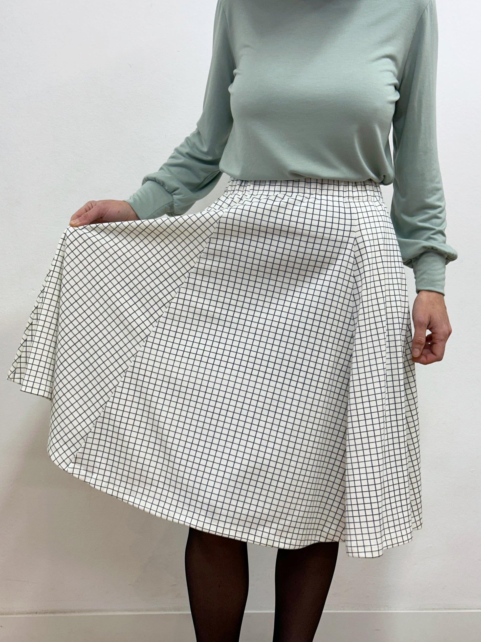 Faldilla llarga fins sota el genoll, confeccionada amb godets simplificats que generen un vol progressiu a partir de la cadera. De la cintura fins a la cadera té una caiguda recta i neta, que després s’obre amb moviment i amplitud.