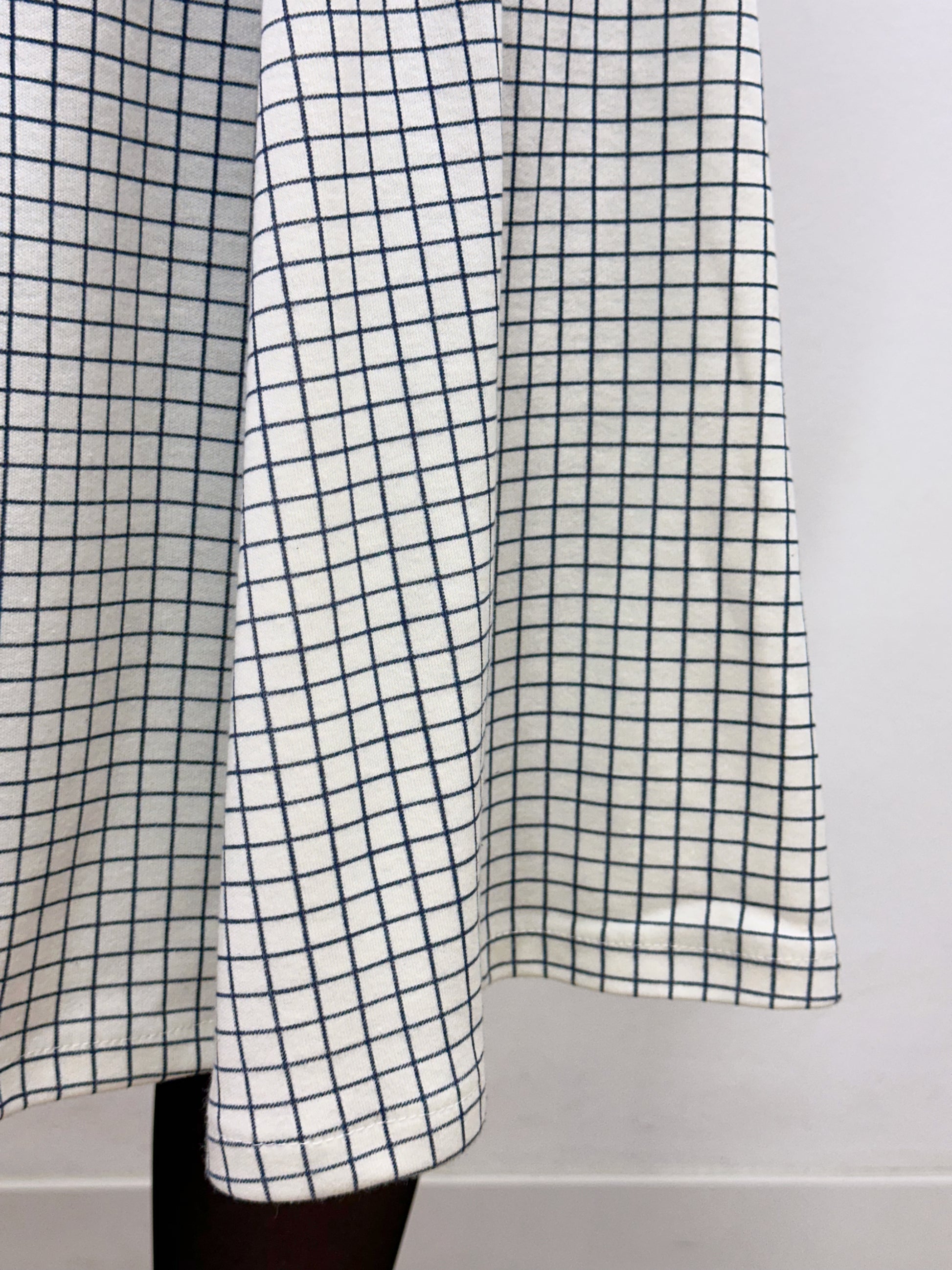 El teixit és lleugerament apelfat, en color blanc amb ratlles blaves que formen petits quadres, aportant textura i personalitat a la peça.