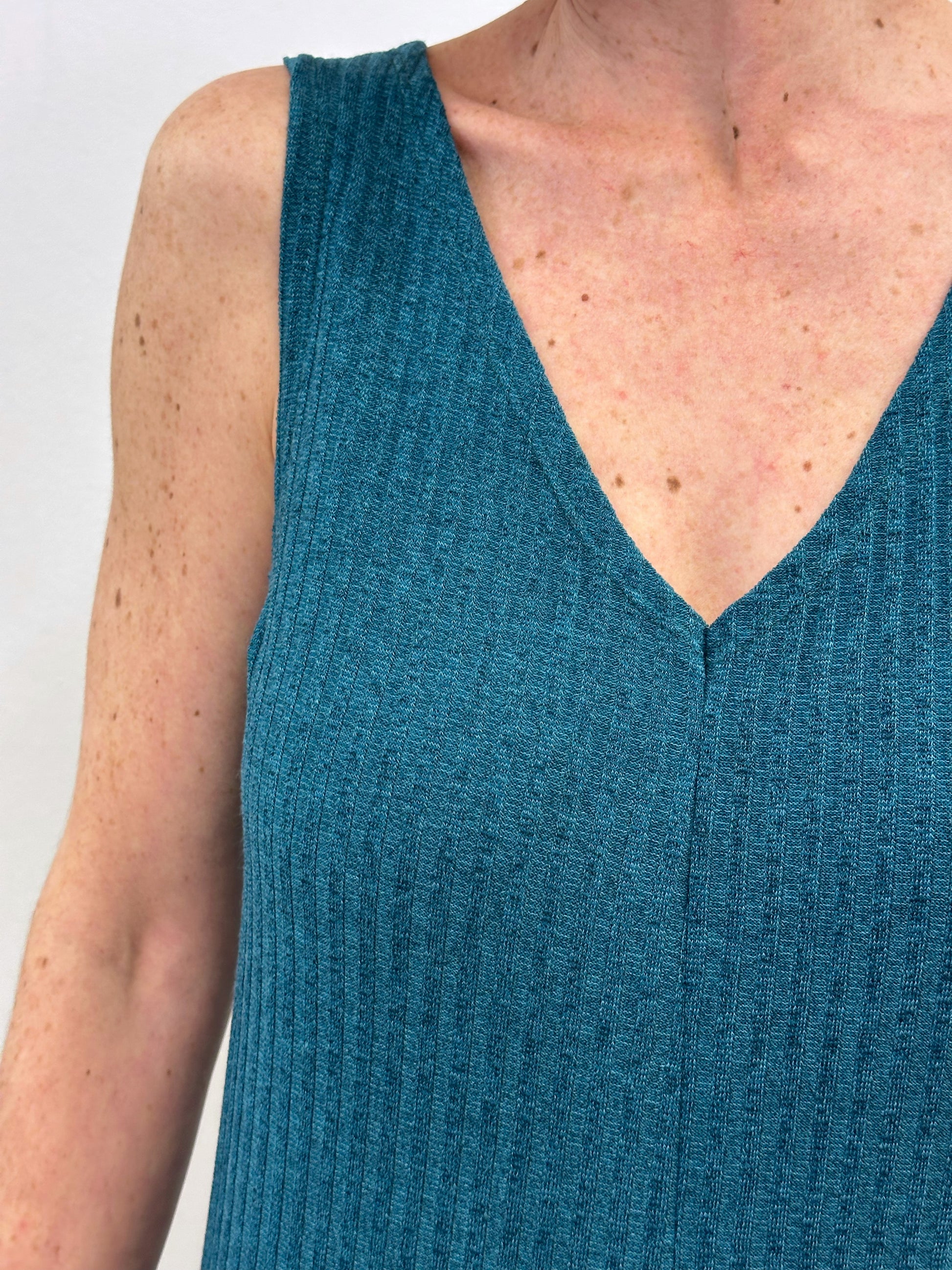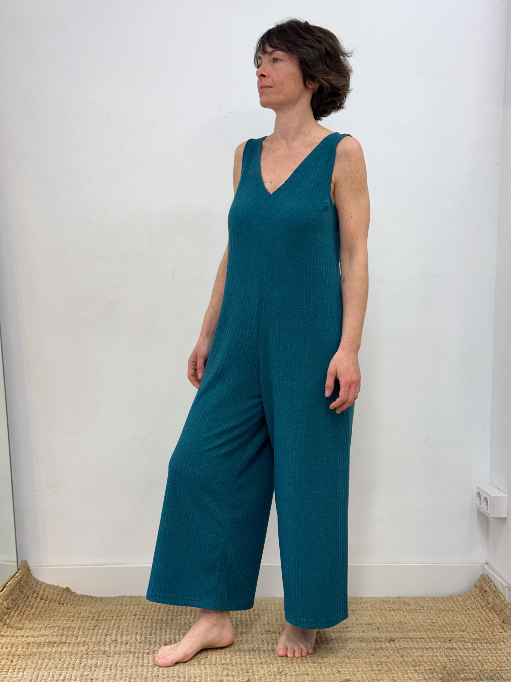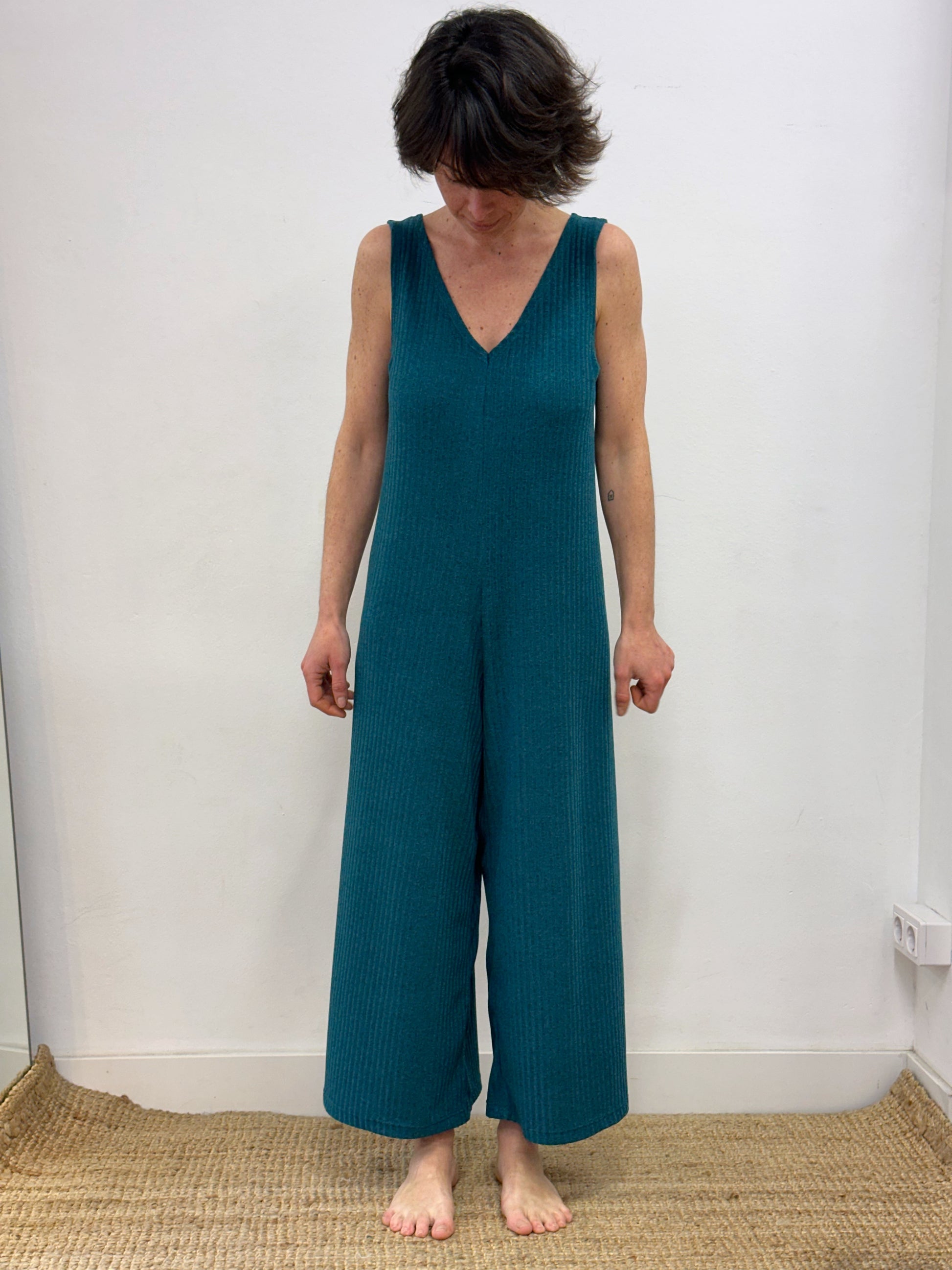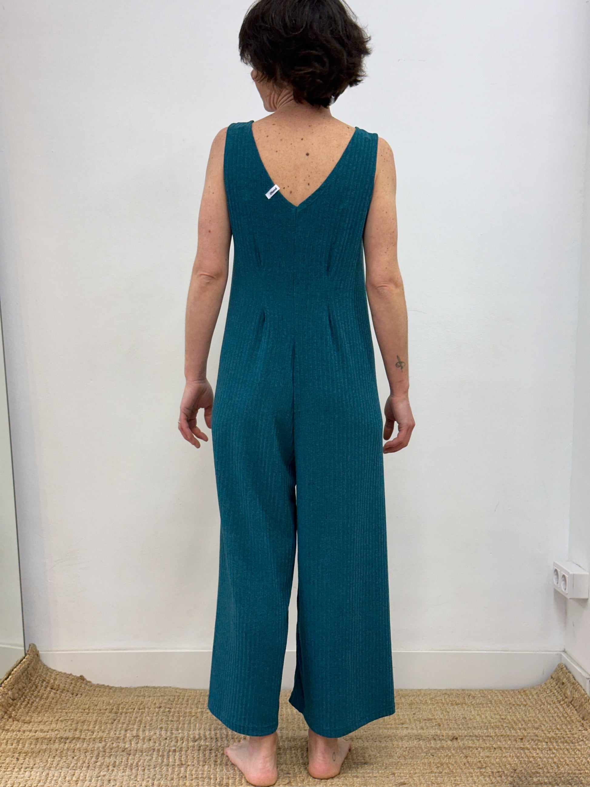 Mono turquesa fosc de tirants, amb coll de pic i ample de cama.