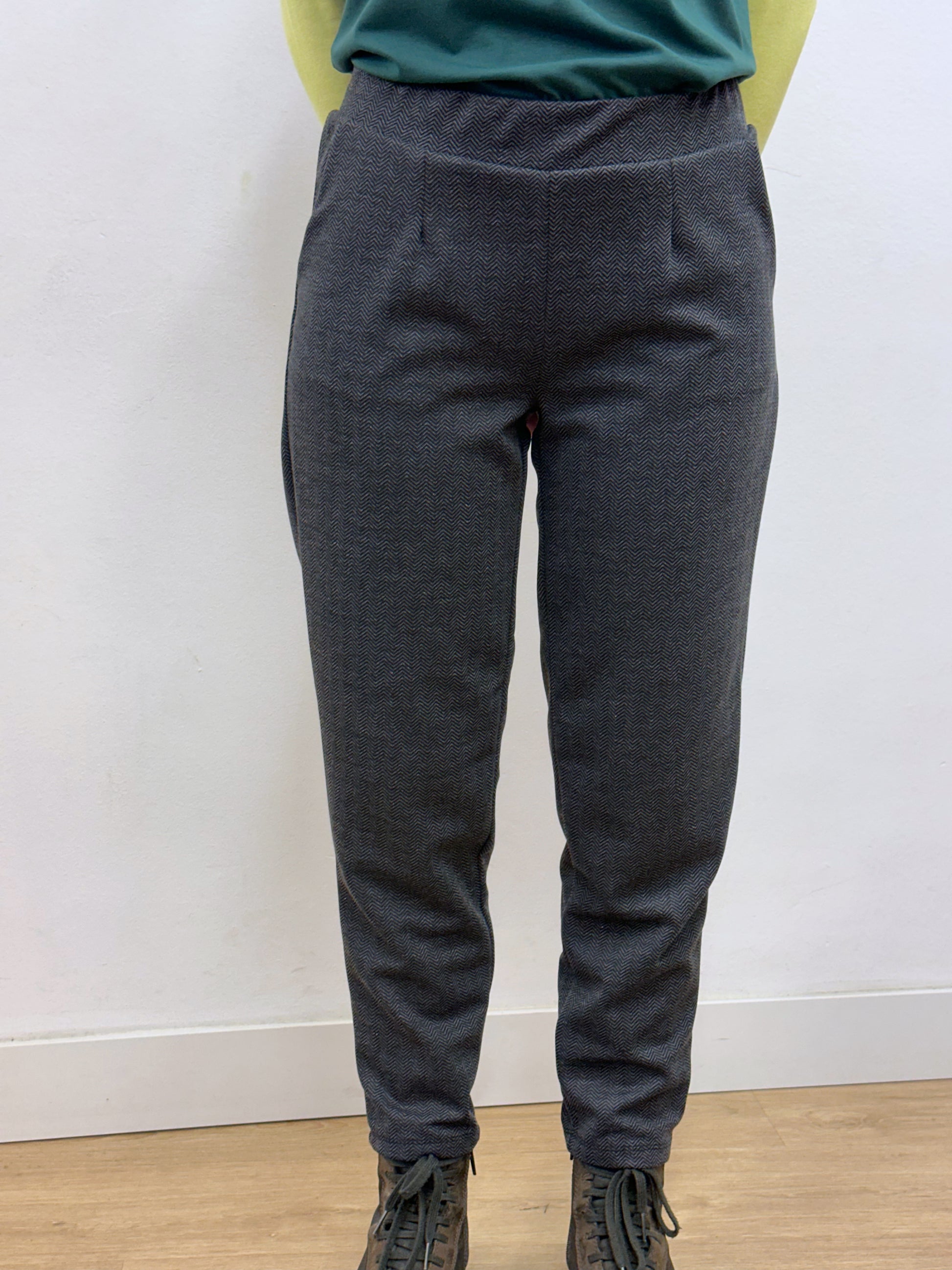 Confeccionats amb punt roma elàstic i resistent, presenten un estampat de petita espiga en gris i negre, un clàssic que no passa de moda.